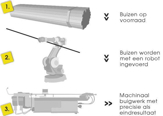 Onze machines buigen de buizen of profielen volledig geautomatiseerd. Het resultaat: perfect maatwerk met een hoge nauwkeurigheid, geschikt voor massaproductie.
